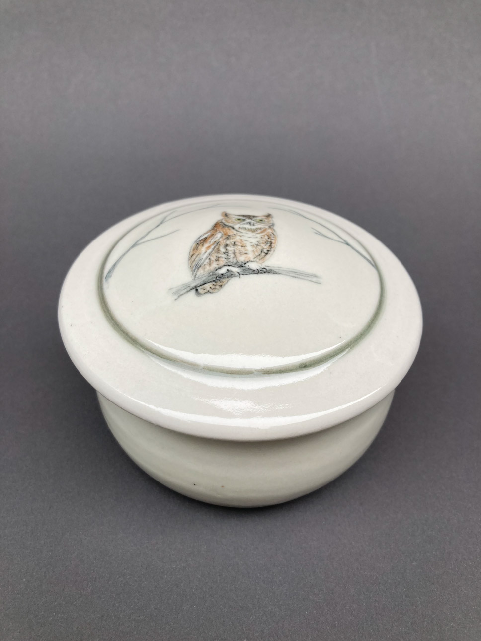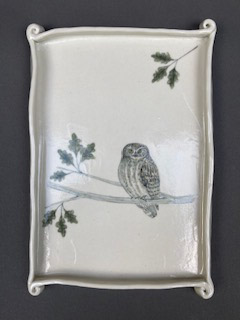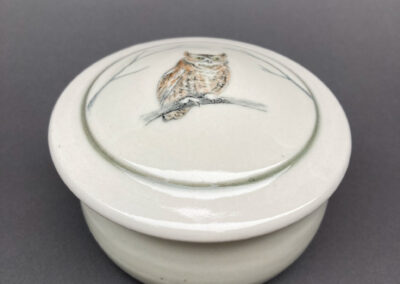 The work is primarily thrown, functional ware with a bit of handbuilding. The high-fired porcelain is decorated with underglaze drawing and painting, using underglaze pencils and washes of color from ceramic stains. The smoothness and light color of the porcelain clay provide a perfect background for my decoration.