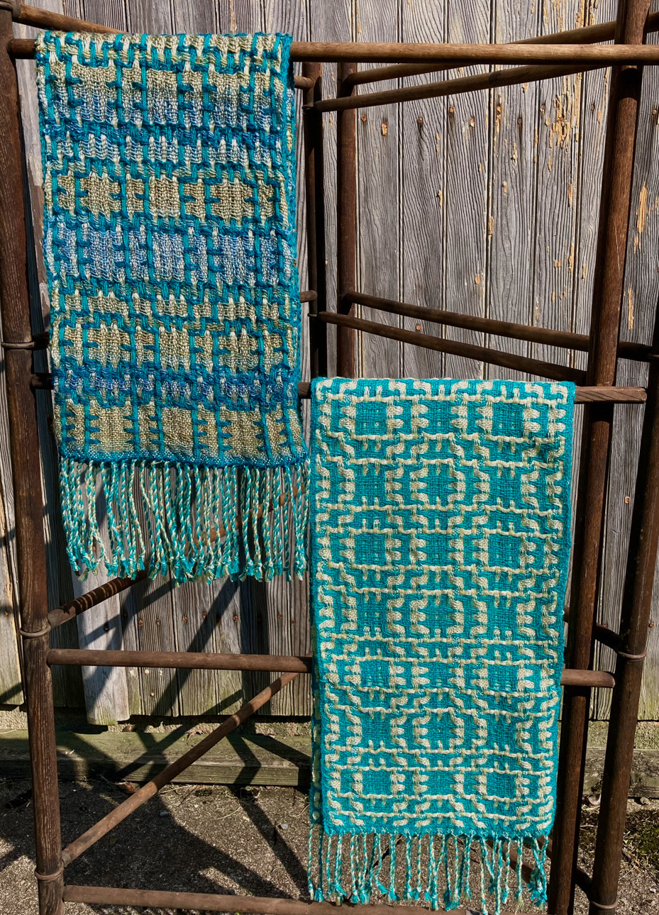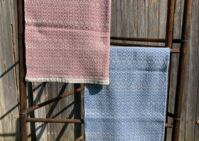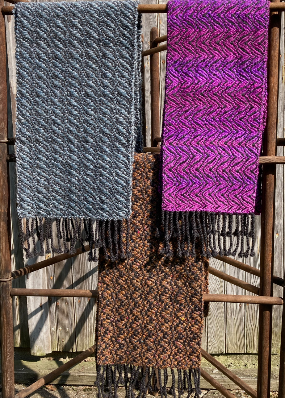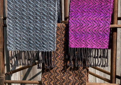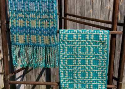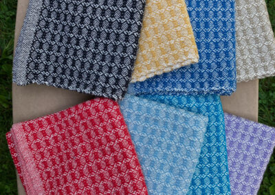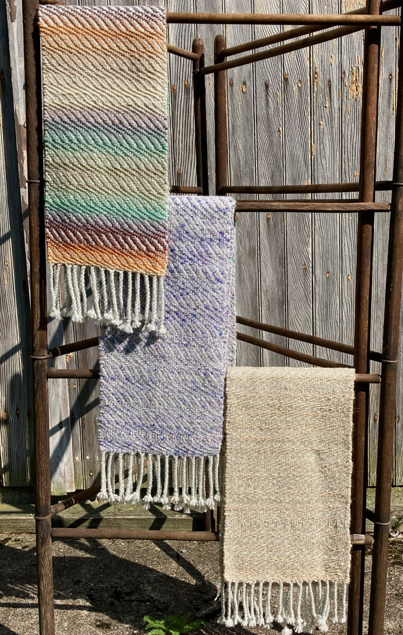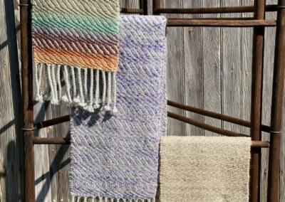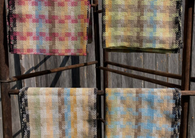 I never considered the arts as a career path – I completed college with a degree in nursing, and worked in the field until retiring.  I have continued to pursue fiber arts as a hobby and my interest has grown over the years.   In the early 70’s, I watched someone spinning yarn, and soon had the opportunity to take a class.  Being able to make my own yarn was thrilling!  I got a spinning wheel – I took a natural dyeing class. I gathered black walnuts and goldenrod and cooked up pots of dye for my yarn.  I thought I would not be interested in weaving – but I was soon borrowing every weaving book in the library and  teaching myself the basics, and soon I had to purchase a loom.