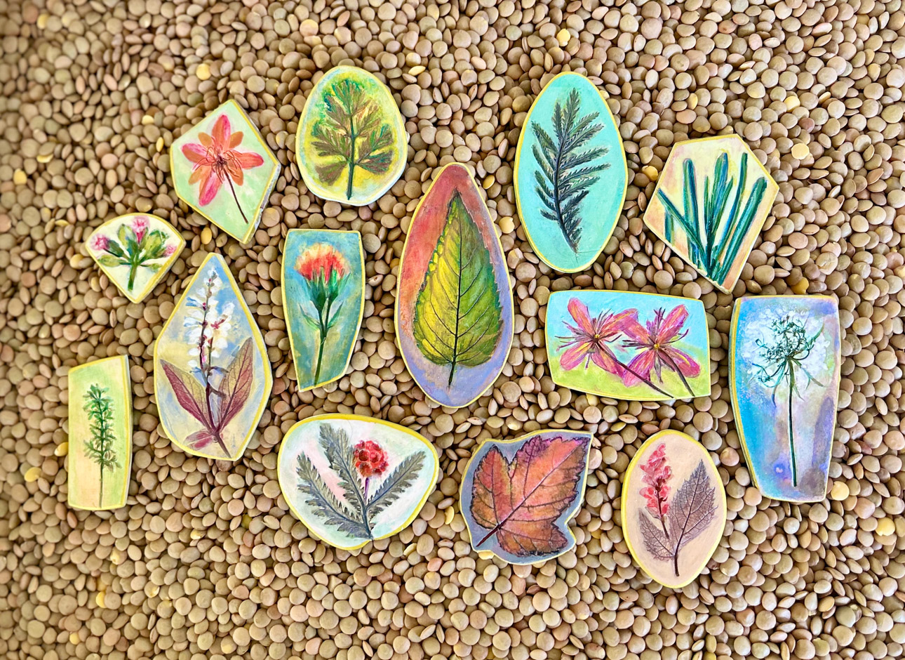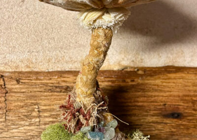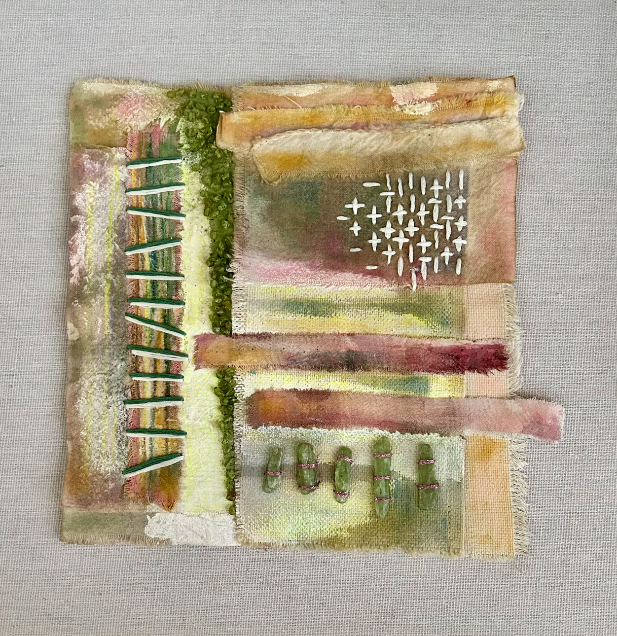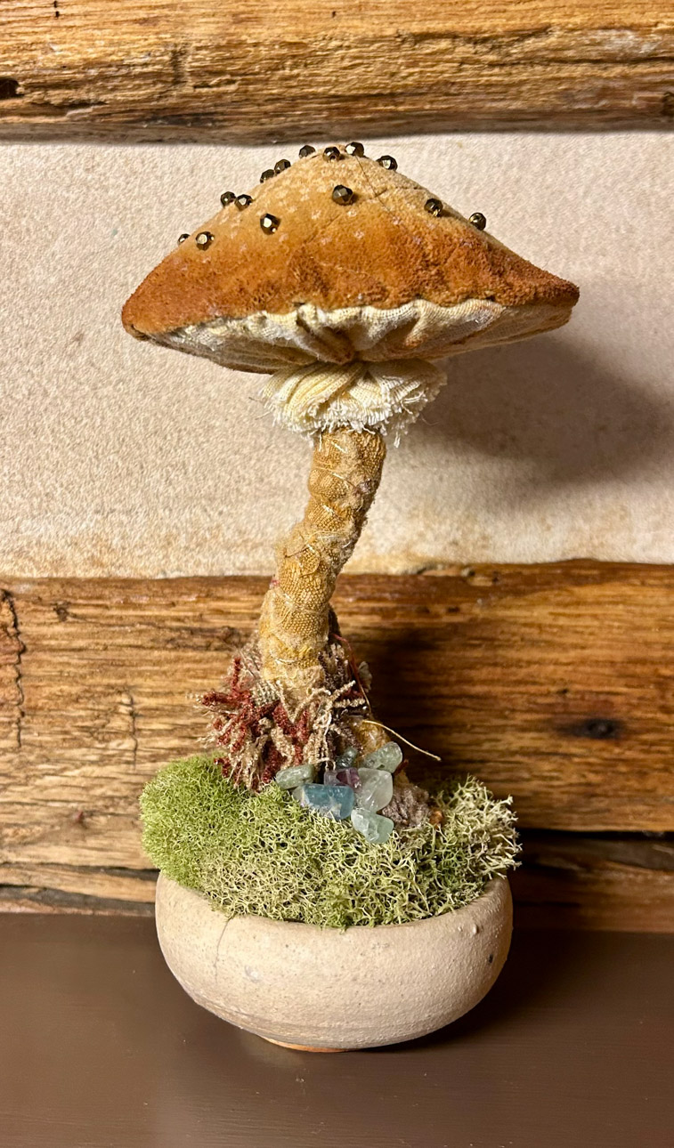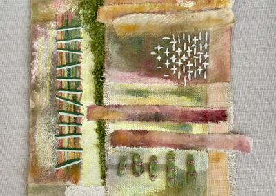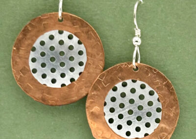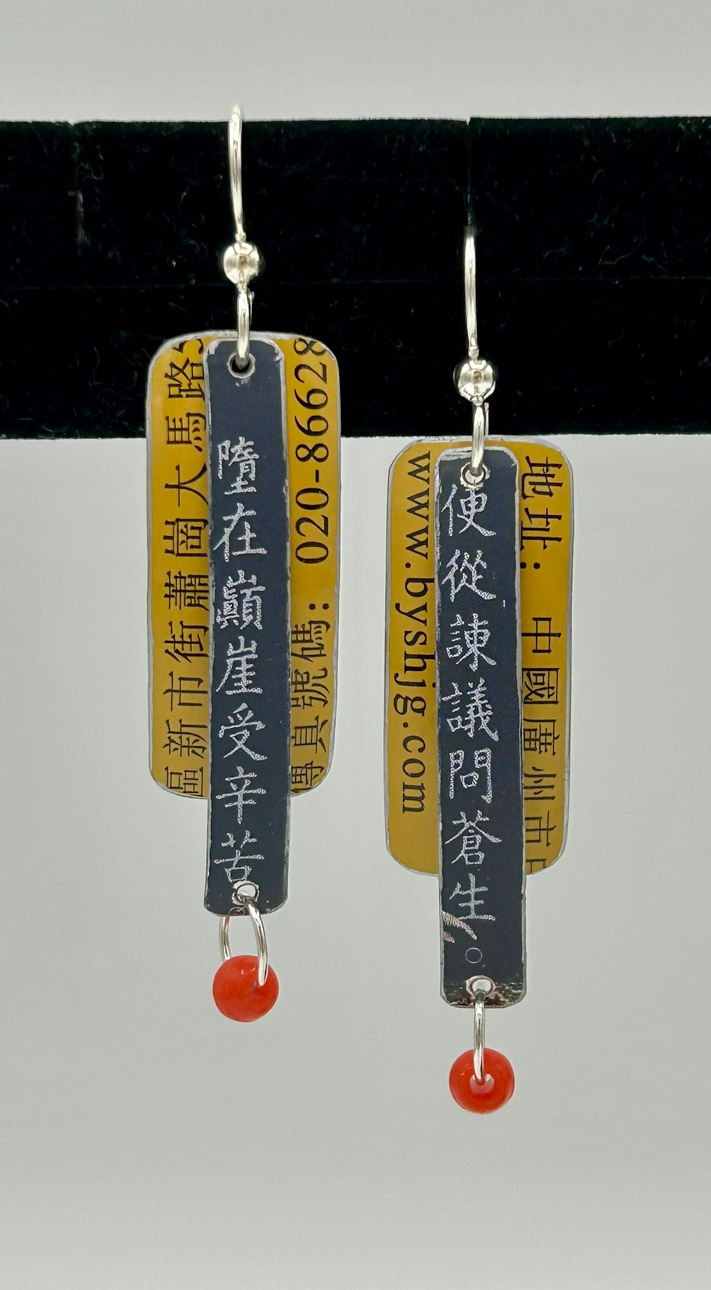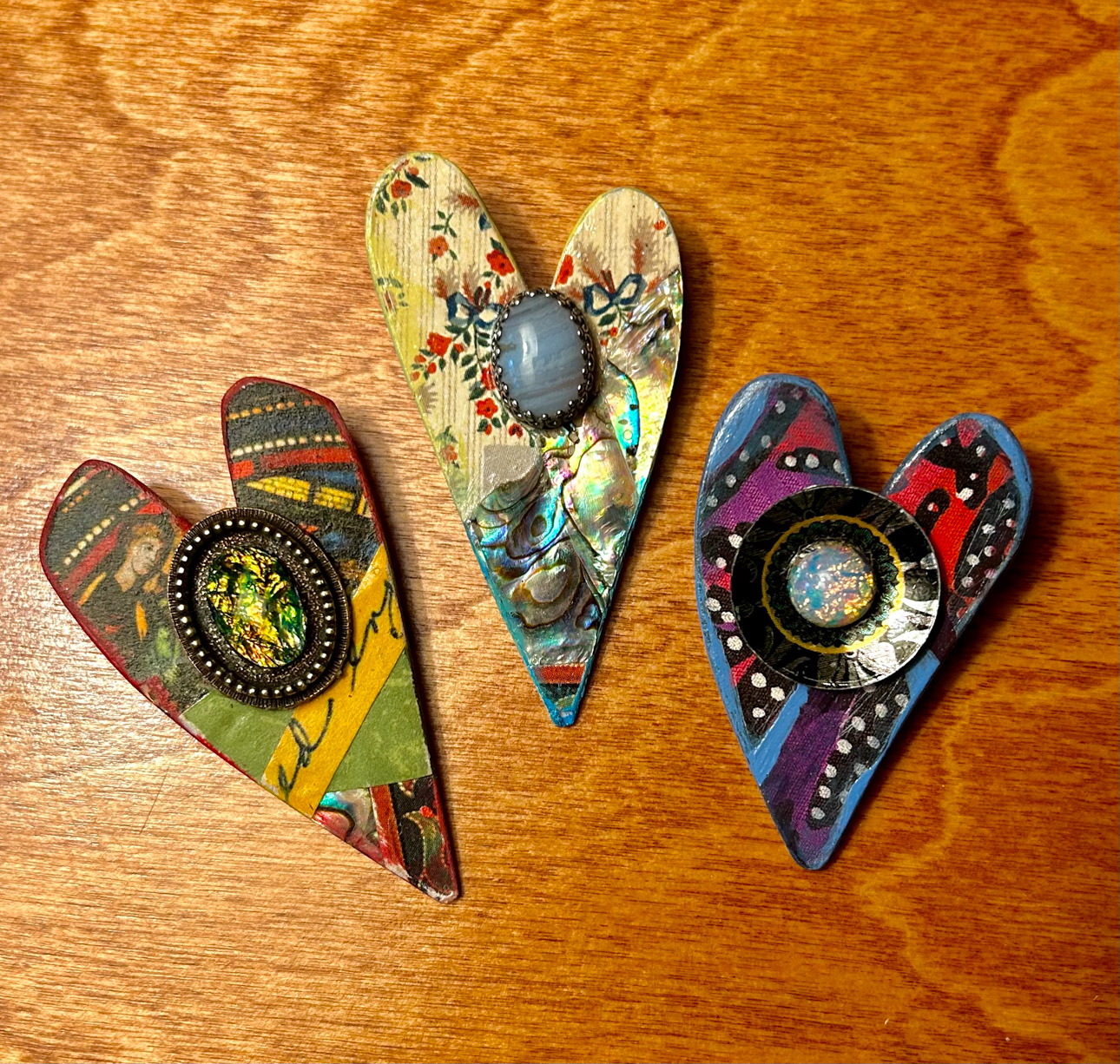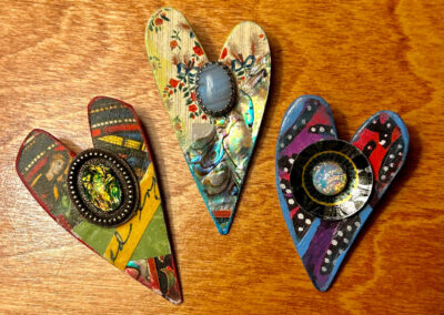 Many art materials have passed through my hands over the years—charcoal, paints, metals, plaster, clay, wood, textiles and papers of all kinds.  I never could limit myself to just one.  This makes for a crowded studio but I like having access to everything at once when working on my mixed media pieces.  I love recycling.  It is very satisfying for me to upcycle overlooked materials such as tea tins and leather scraps by incorporating them into my handmade sterling silver jewelry.  Found objects can inspire creations of all sorts.  Collecting piles of unusual “stuff” is half the fun.  Machine parts, game pieces, glass shards and other oddball items often find their way into my wearables, sculptures and, recently, my painted fabric collages.