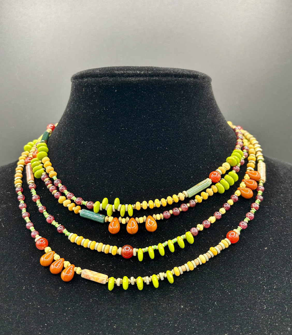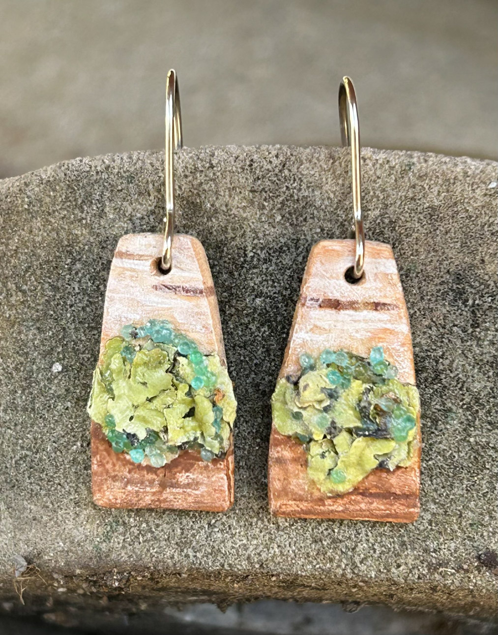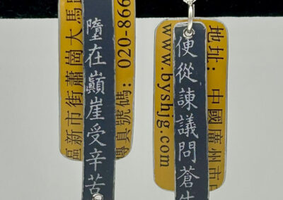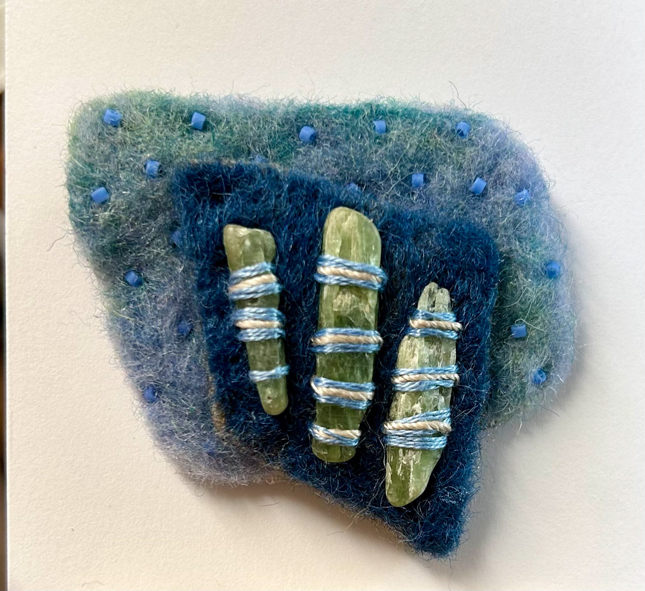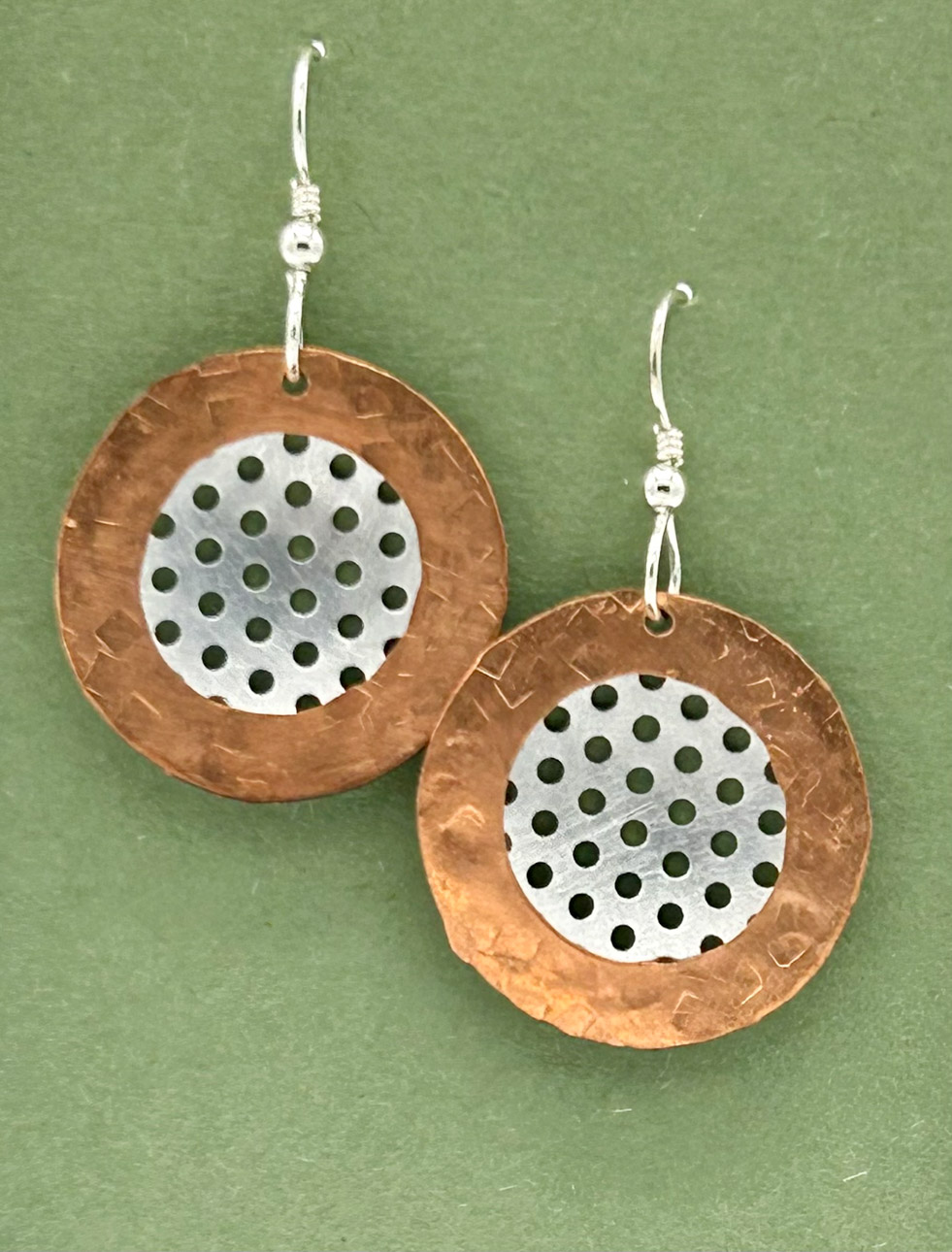 Many art materials have passed through my hands over the years—charcoal, paints, metals, plaster, clay, wood, textiles and papers of all kinds.  I never could limit myself to just one.  This makes for a crowded studio but I like having access to everything at once when working on my mixed media pieces.  I love recycling.  It is very satisfying for me to upcycle overlooked materials such as tea tins and leather scraps by incorporating them into my handmade sterling silver jewelry.  Found objects can inspire creations of all sorts.  Collecting piles of unusual “stuff” is half the fun.  Machine parts, game pieces, glass shards and other oddball items often find their way into my wearables, sculptures and, recently, my painted fabric collages.